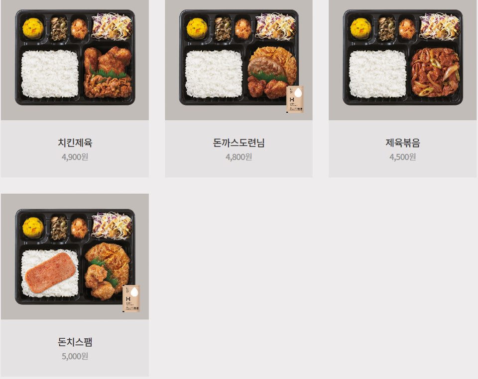 2) 사각도시락: 고기고기시리즈, 모둠시리즈, 정식시리즈로 구성되어 있습니다.